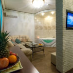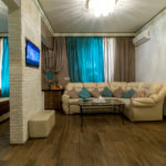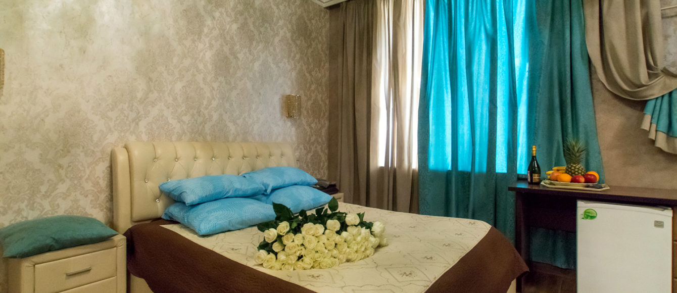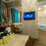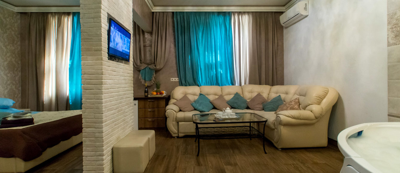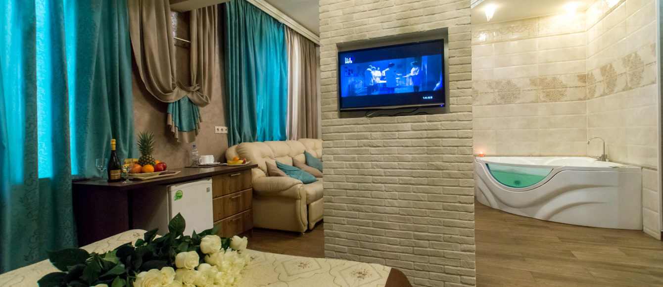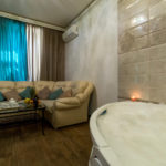 Площадь номера 45 кв. м, кровати: двуспальных 1, больших двуспальных 1. В номере: Кондиционер, Wi-Fi, ТВ, сейф, душ, кухня, рабочая зона, полотенца, джакузи.